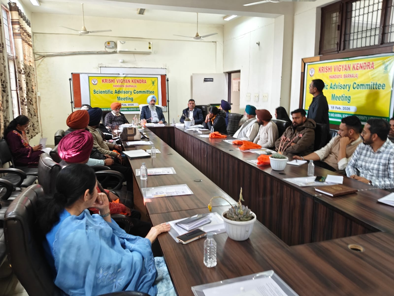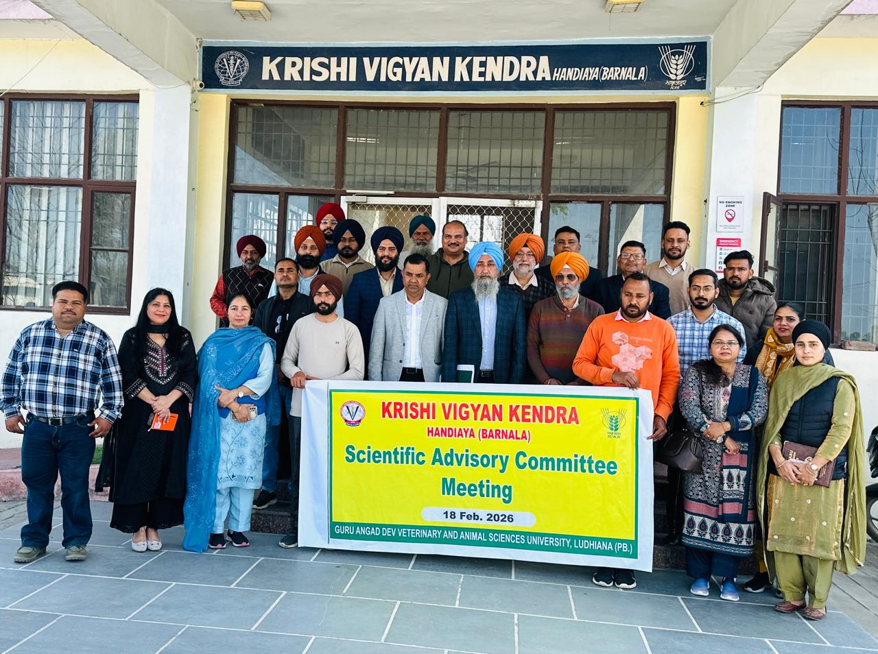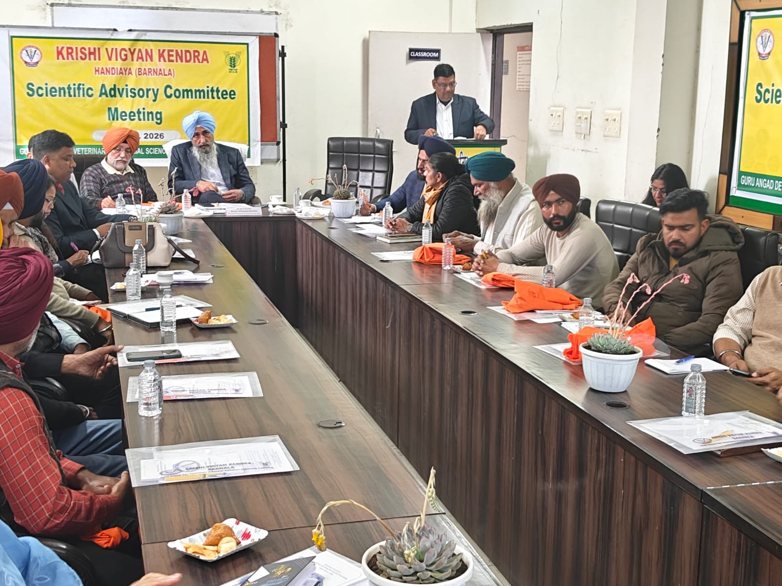 Scientific advisory Committee meeting of Krishi vigyan Kendra, Barnala of Guru Angad Dev Veterinary & Animal Sciences University, Ludhiana is organised in guidance of Dr.Prahalad Singh Tanwar, Associate Director, KVK Barnala. Dr.R.S.Grewal , Director Extension Education, GADVASU, Chaired the meeting and Dr. Parminder Singh, Additional Director Extension Education were accompanied . Dr.Udaiveer Chahal ,Professor Department of Animal Nutrition, Dr. Daljeet Kaur, Associate Professor ,LPM,.Dr.Rahil Anurag Senior Scientist, CIPHET, Ludhiana, Dr. Karamjeet Singh, Deputy Director Animal Husbandry Barnala, S. Gurprit Singh , DDM, NABARD Barnala, Assistant Director Fisheries Barnala, Representative of Dairy Development, Department of Agriculture,Soil Conservation Barnala.Sh.Gurdev Ram Nimbhwala Mour progressive dairy farmer, S. Prem Singh Kaleke, S.Sukhdeep Karamgargh and other officials were present in this meeting. Dr. P.S.Tanwar welcome to Dr.R.S.Grewal and other members of the Committee and presented action taken report of decisions taken during last SAC Meeting, Achievements of KVK Barnala during 2025, Action plan for the year 2026- 27 was discussed in details. Dr.R.S.Grewal gave their valuable suggestions to improve the action plan. Other officials also contribute their suggestions. Director Extension Education also visited KVK Farm and demonstration units at KVK Handiaya. All the members of SAC were satisfied with activities under taken by KVK Barnala during 2025.The KVK staff Dr.Suryendra Singh AP ( Agronomy), Dr.Harjot Singh AP ( Horticulture), Dr.Anjuly Sharma AP( Home Science), Dr.Rajinder Kaur AP( Fisheries), Dr.Sanjay Kumar SMS ( Plant Protection) were also present in the meeting.